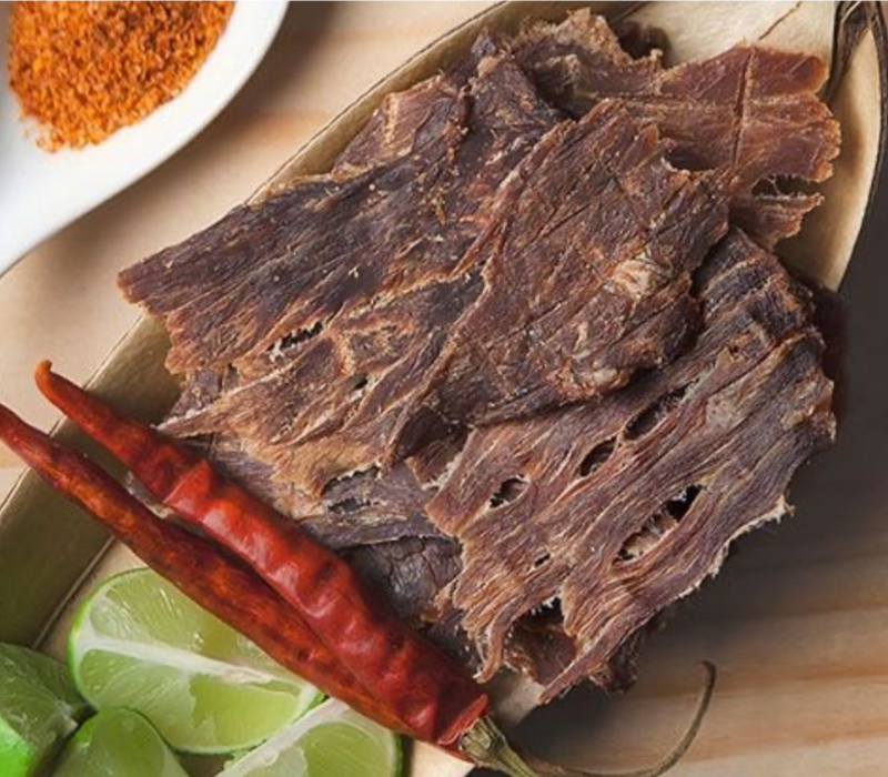120 gramos de carne seca, la mejor calidad acompañado de pepinos, limones y salsa