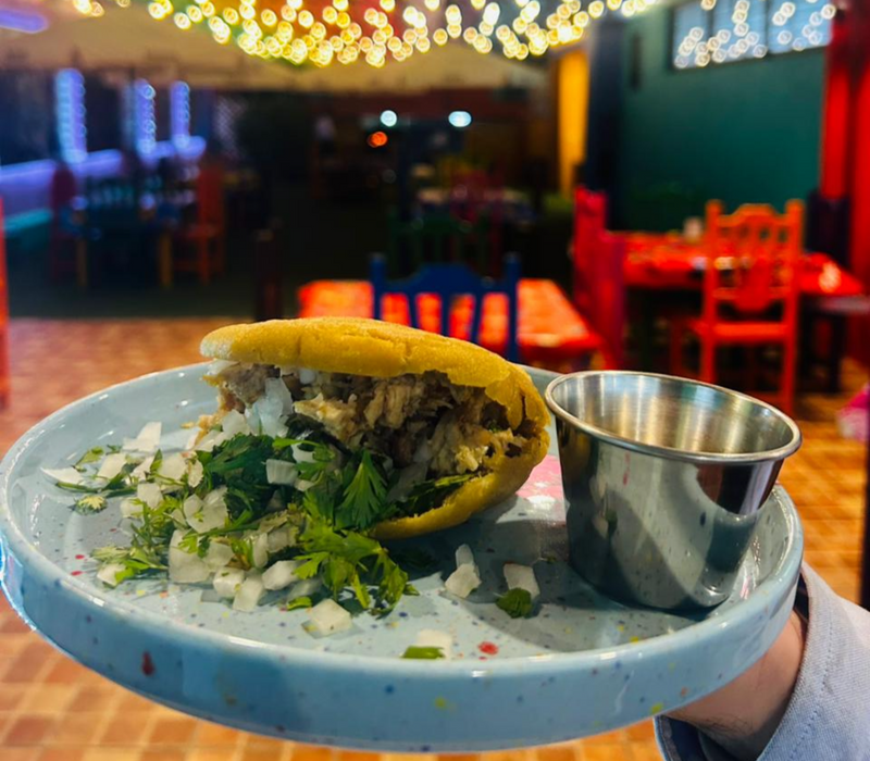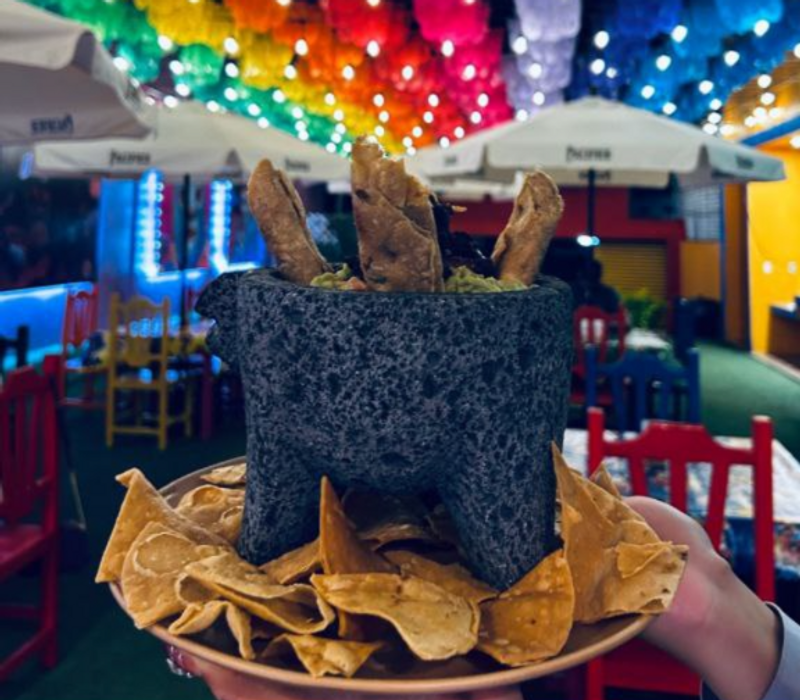 Aguacate 🥑 , cebolla, jitomate acompañado de totopos, trocitos de chistorra y taquitos de Pulled Pork