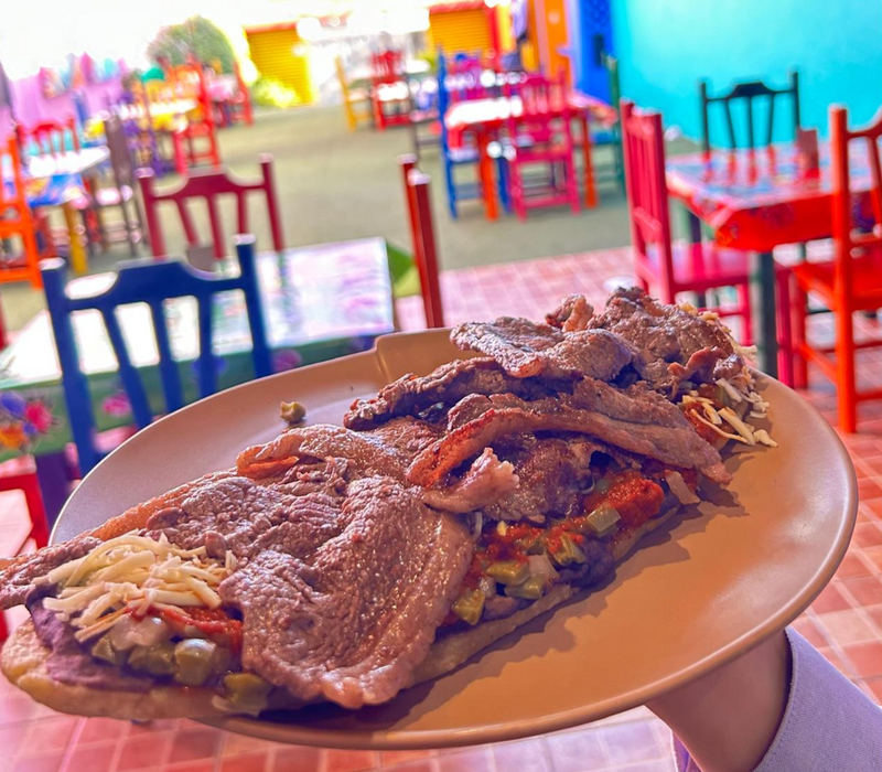 Huarache con una cama de frijol y nopales, con 300g de picaña y sus dos salsas.