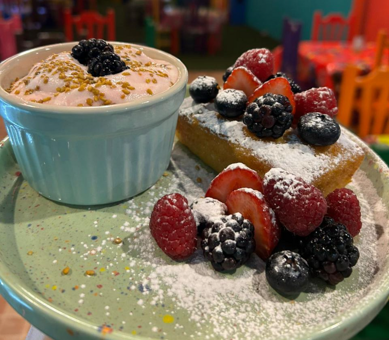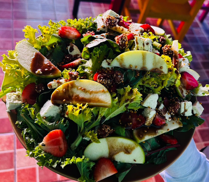Ensalada con mix de lechugas finas, fresa, medias lunas de manzana, ajonjolí, cacahuate garapiñado, cuadritos de queso de cabra, trocitos de pollo y vinagreta. 400gr