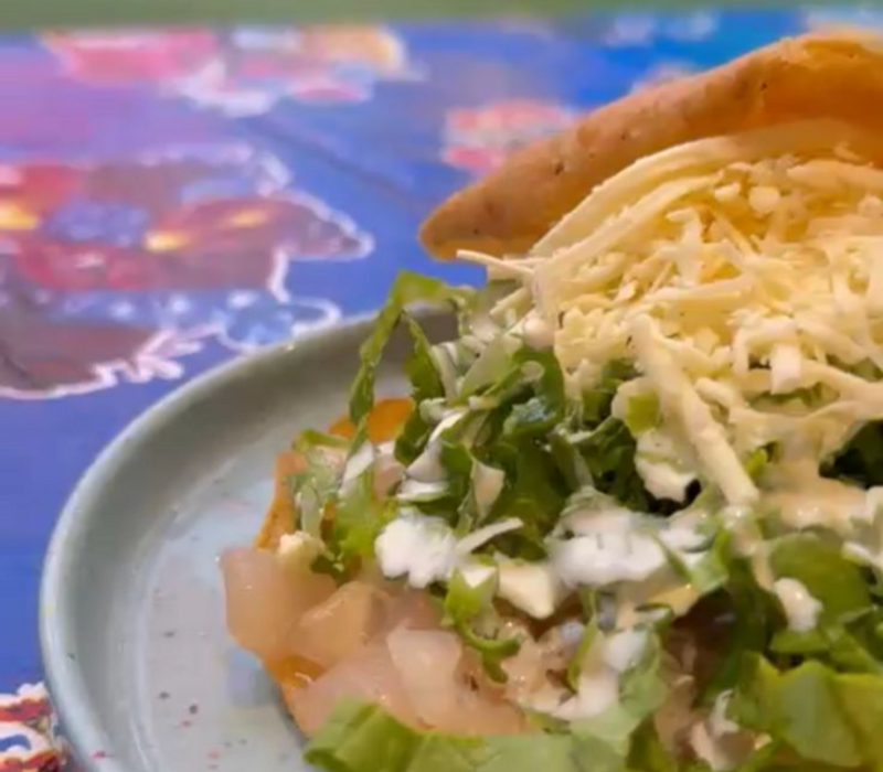 Tostada de tu elección (Tinga de pollo, tinga de res, pata, picadillo), acompañada de una cama de frijoles, lechuga, queso rallado y crema.