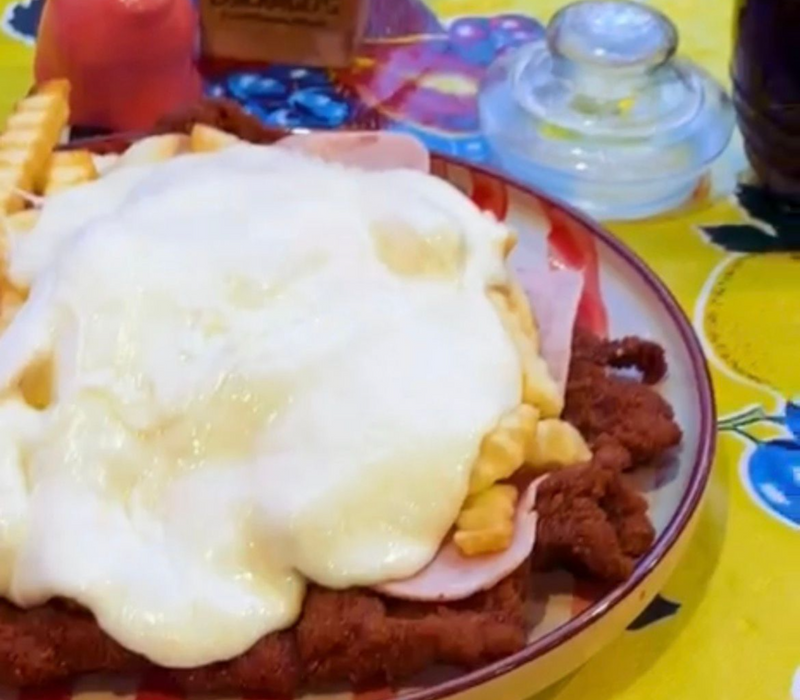 Milanesa de res (300g) acompañado de jamón, papas a la francesa, plátano macho y queso gouda