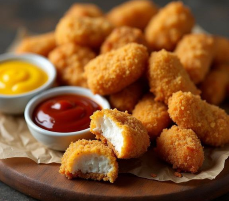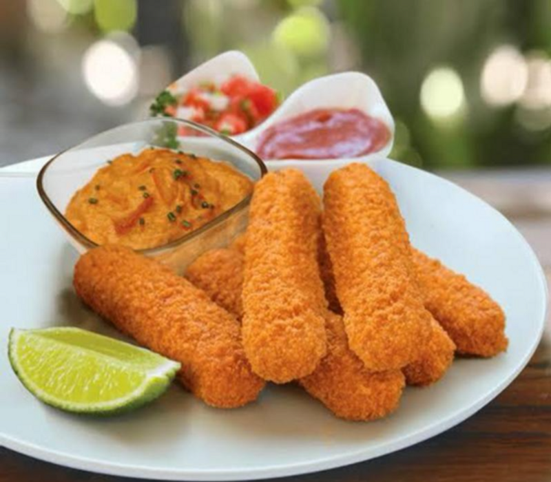 8 barritas de pescado empanizado, acompañados de papas, aderezos y limón.