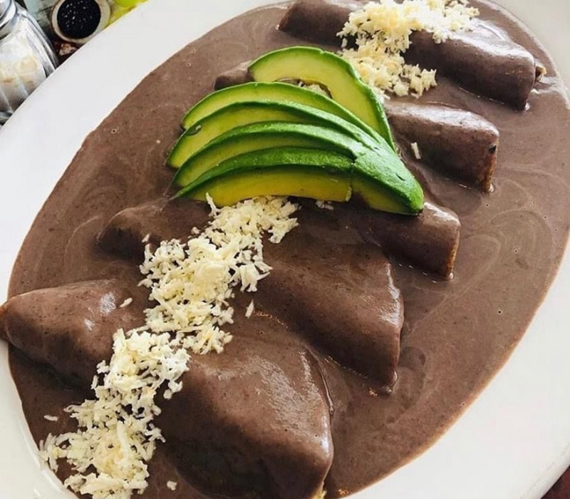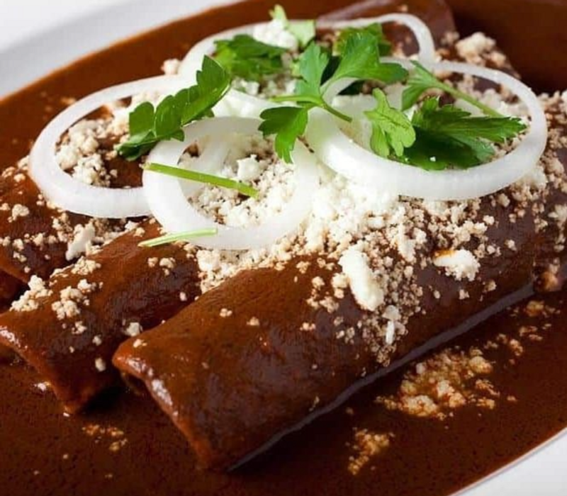 Orden de 5 enchiladas con pollo bañadas con mole de la casa, acompañadas de consomé de pollo