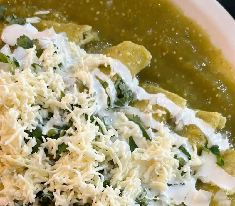 Orden de 5 enchiladas con pollo bañadas en salsa verde, acompañadas de consomé de pollo