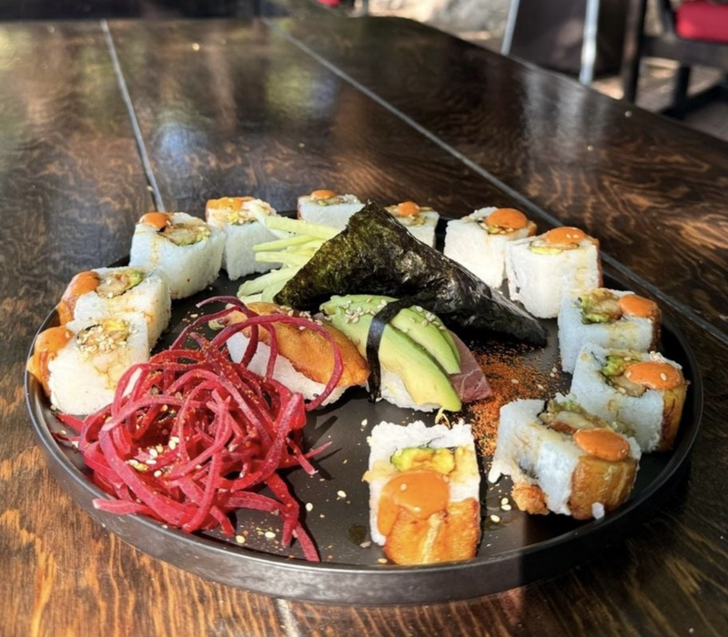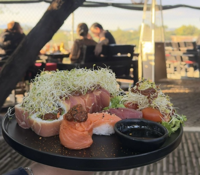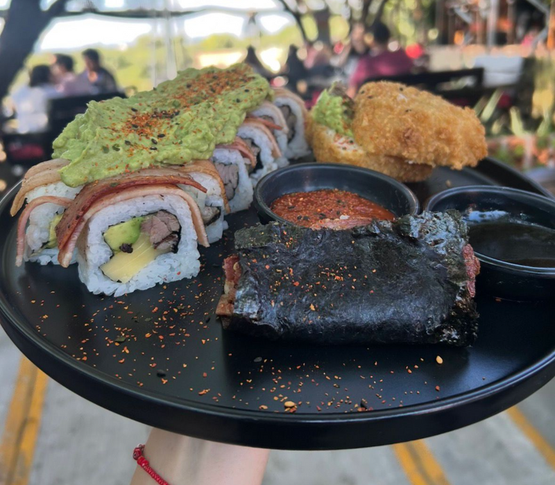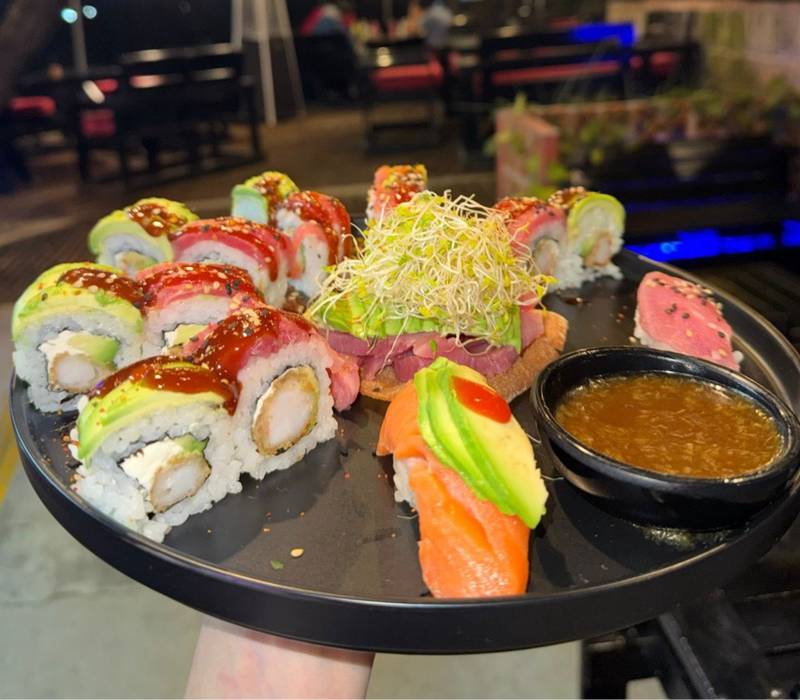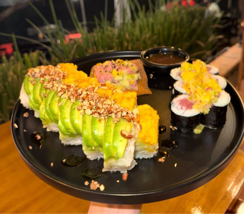 Complemento: 1 tostada wonton de atún, aguacate y germen de alfalfa, 1 rollo primavera