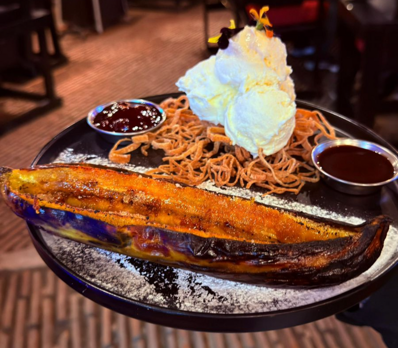 Brioche sandwich with 200gr picaña slabs, herb dressing, pineapple glazed with cinnamon, manchego cheese and roasted onion.