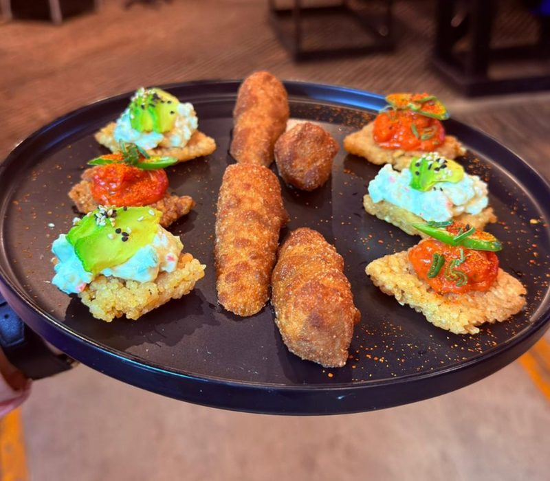Tostada de arroz, con Tampico, aguacate y salsa anguila