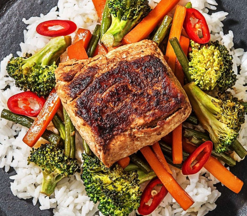 Salmón en salsa de naranja, Teppanyaki de verduras (Zanahoria, calabaza, espárragos, champiñon y cebolla) y arroz yakimeshi