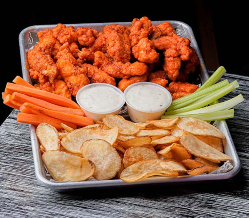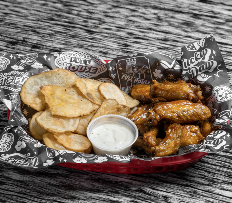 Crujientes alitas de pollo, bañadas en salsa a elegir, acompañadas de papas a la francesa o chips y aderezo.