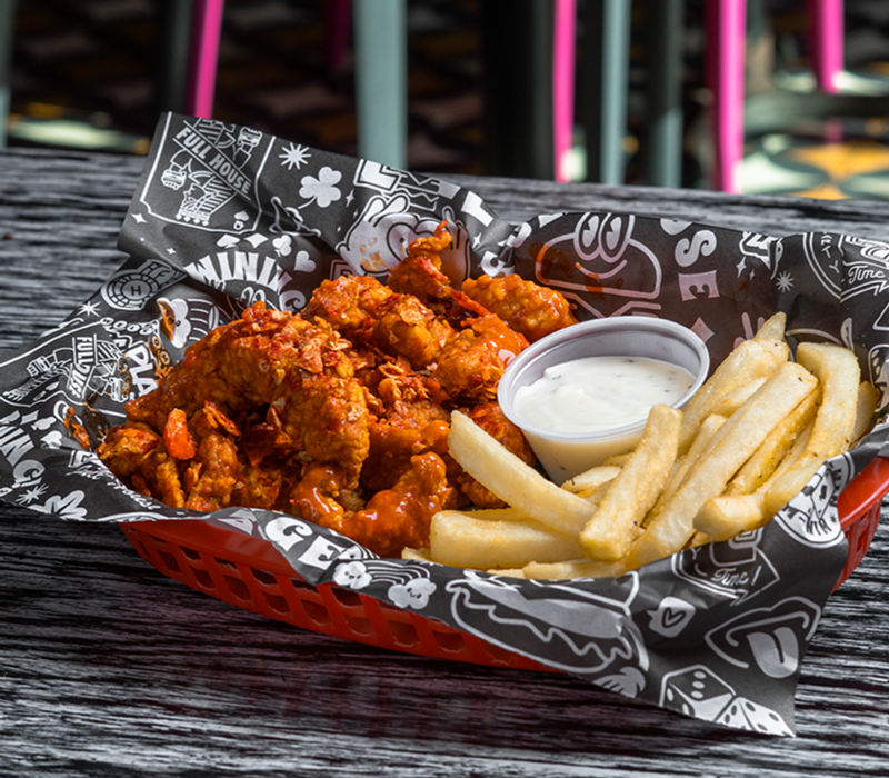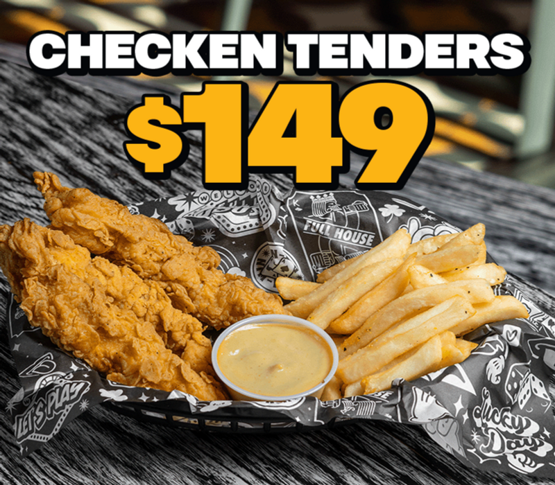 Tiras crujientes de pechuga de pollo (250 gr.) bañadas en tu salsa favorita. acompañadas de papas a la francesa o chips y aderezo.