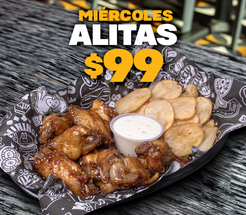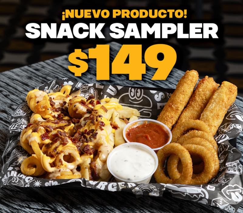 Alitas 600 grs ó boneless, salsa a elegir, 4 dedos, 10 aros de cebolla, cheese Wedges potatoes, ranch, chipotle, salsa marinada.
