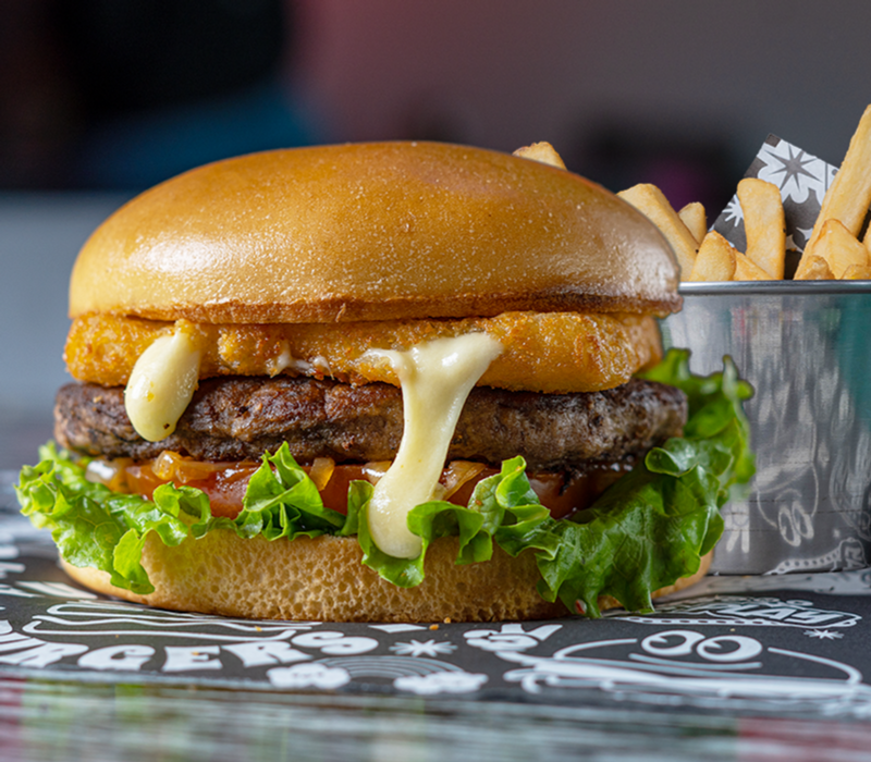 Hamburguesa con carne, queso, aros de cebolla, tocino, lechuga, tomate, ranch y papas a elección.