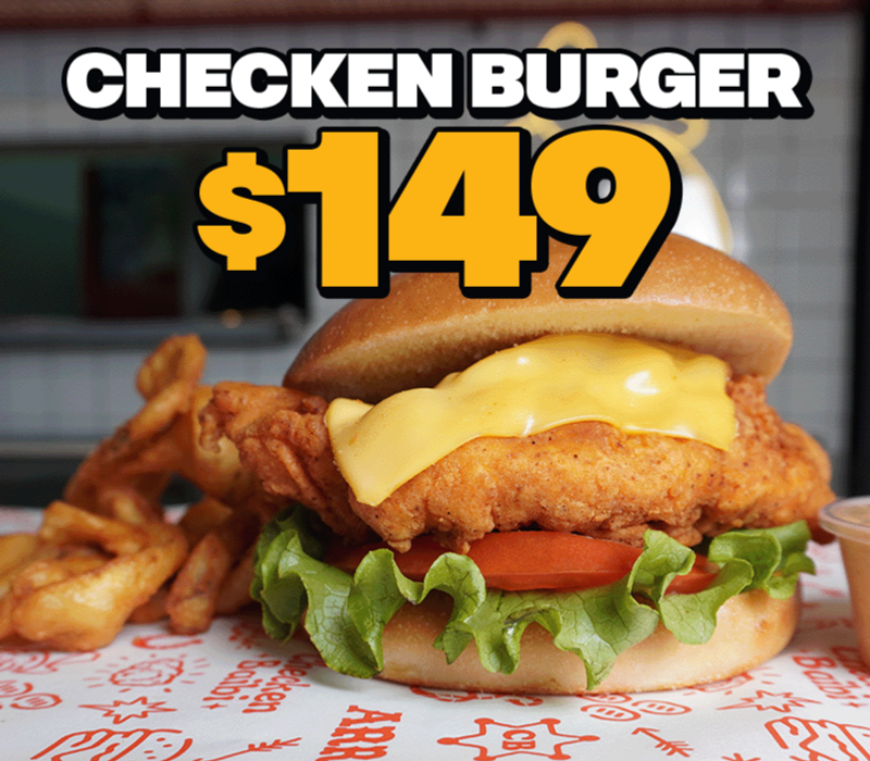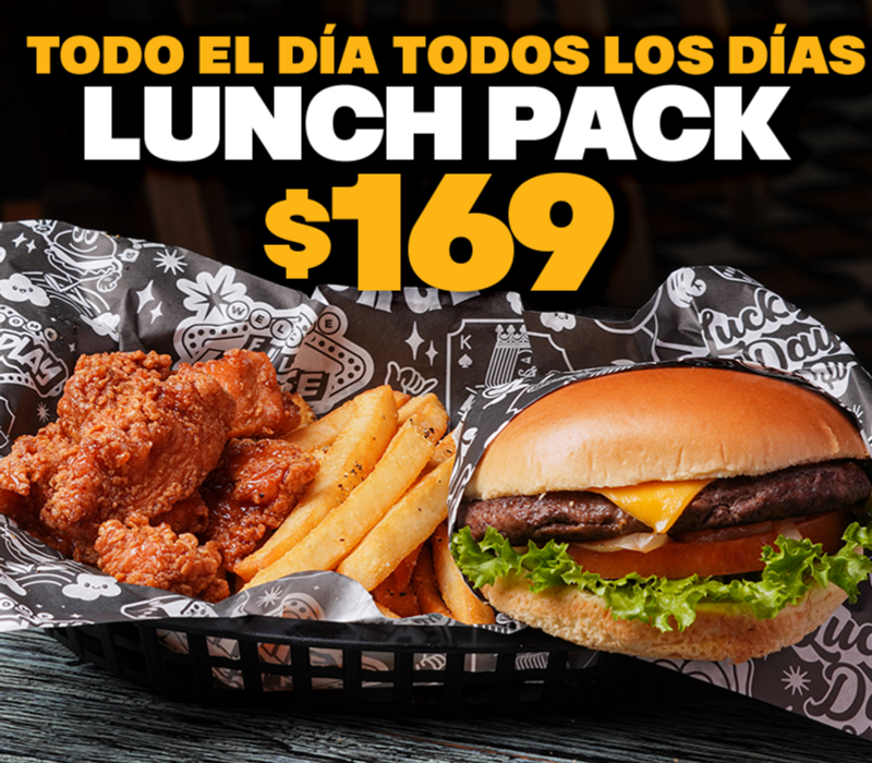 Hamburguesa en pan brioche, tenders de pollo con queso americano, lechuga y tomate y aderezo delicón.