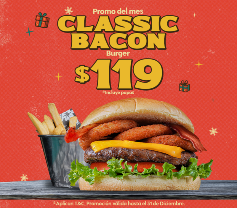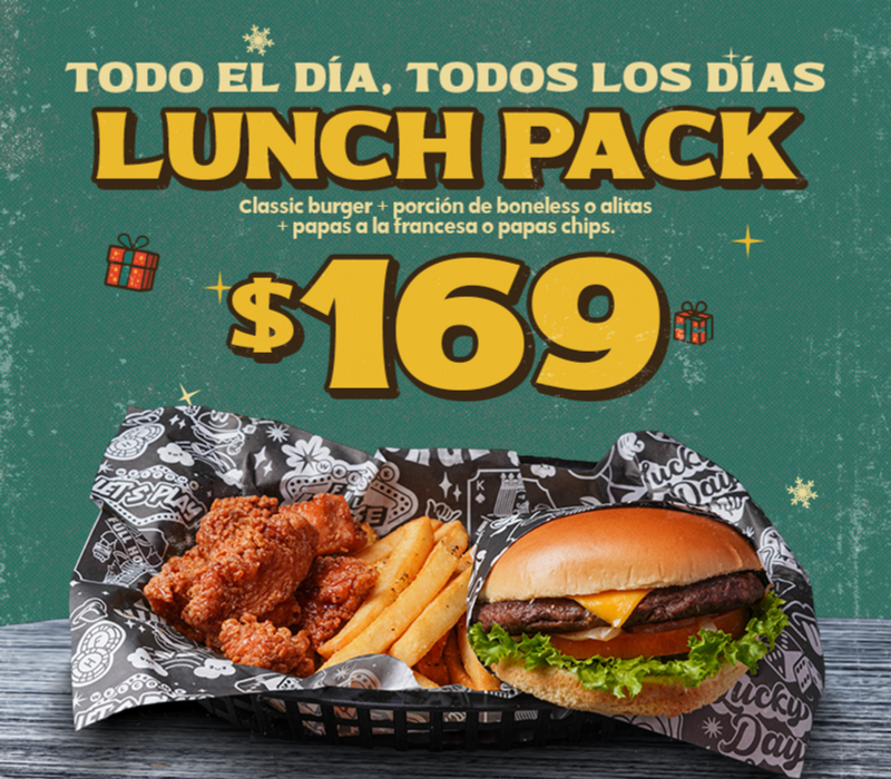 Classic burger (2), mix de papas. porci贸n de boneless o alitas, 2 aderezos a elegir.