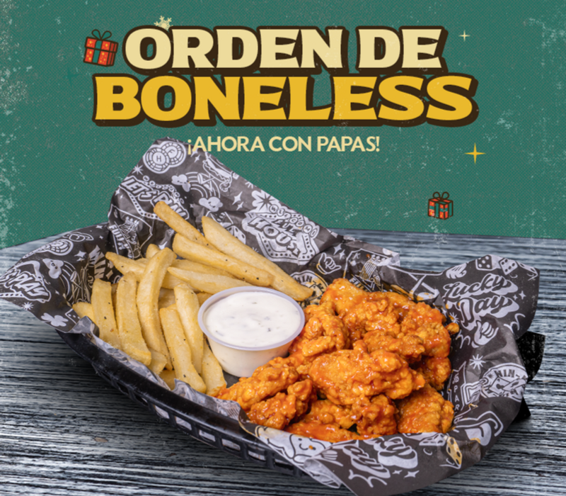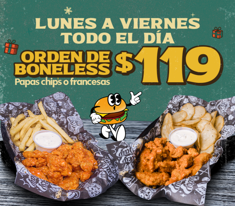 Alitas 600 grs 贸 boneless, salsa a elegir, 4 dedos, 10 aros de cebolla, cheese Wedges potatoes, ranch, chipotle, salsa marinada.