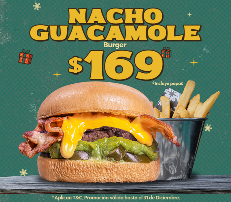 Carne de Sirloin (150 gramos), Jalape帽o, guacamole, tocino, queso para nachos y aderezo ranch chipotle.