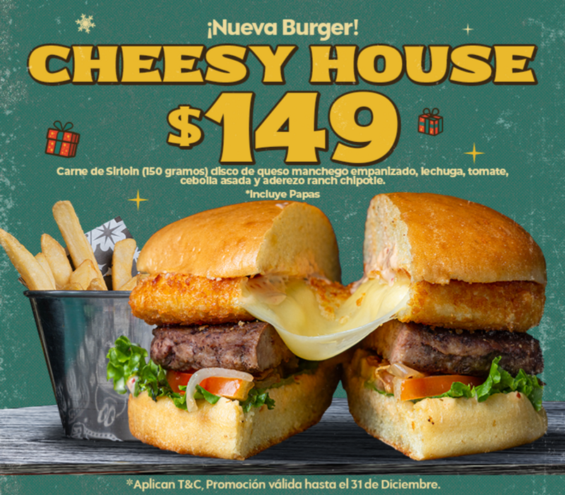 Carne de sirloin, disco de queso manchego empanizado, lechuga, tomate, cebolla asada y aderezo ranch chipotle, con papas a elecci贸n.