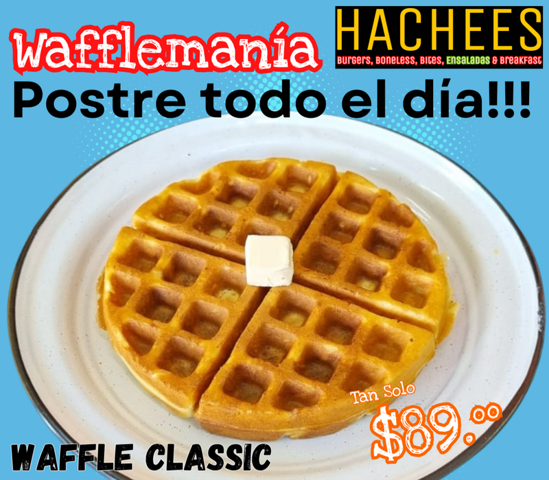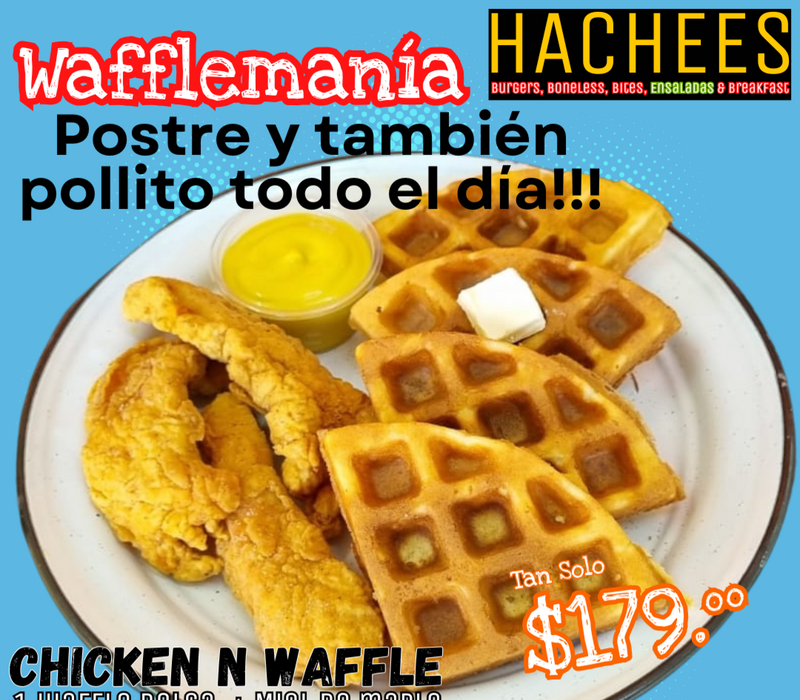 Waffle belga hecho al momento acompañado de 3 tenders, 1 aderezo, miel de maple.