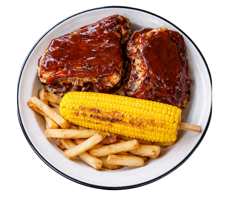 Elige entre 300 y 600 gramos de riquísima costilla de cerdo bañada en salsa BBQ acompañada de 1 golden corn y 150 gramos de french fries