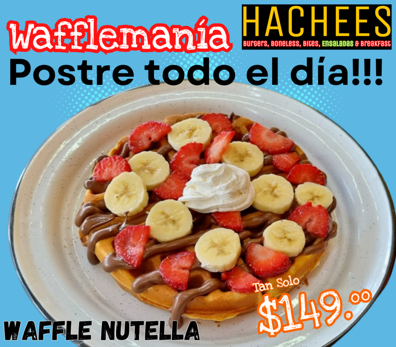 Delicioso waffle hecho al momento, con Nutella, platano, fresas y crema batida