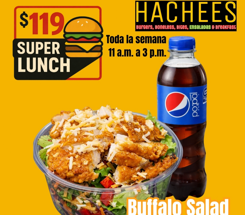 Buffalo Salad Super Lunch! No aplica ingredientes por separado, cualquier modificación puede generar cargo extra, promoción válida del 17 marzo al 14 de junio del 2026.