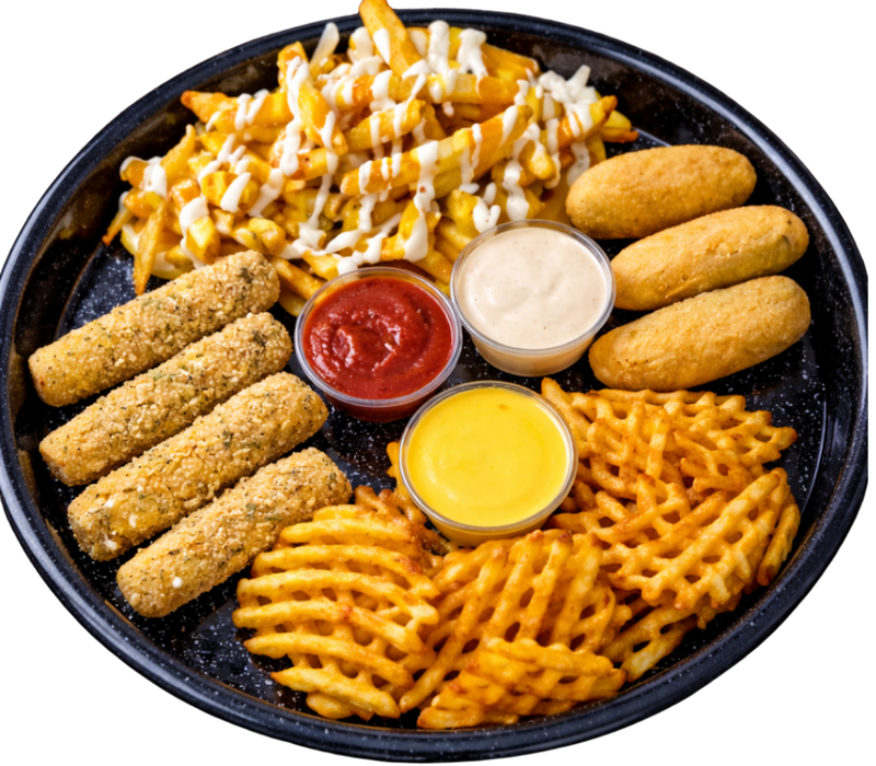 Incluye: 1 Cheese Burger, 1 Chicken Buffalo, 6 Boneles en salsa a elegir, 250 gramos de French Fries, 1 aderezo ranch y bastones de apio y zanahoria. Ideal para disfrutar de cualquier evento deportivo con el delicioso sabor de Hachees, o ¿por que no? para compartir el antojo con quien gustes!