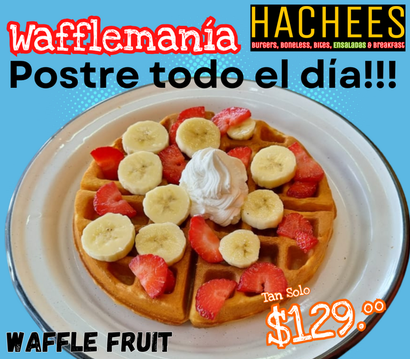 Delicioso waffle hecho al momento, con miel de maple por separado, platano, fresas y crema batida