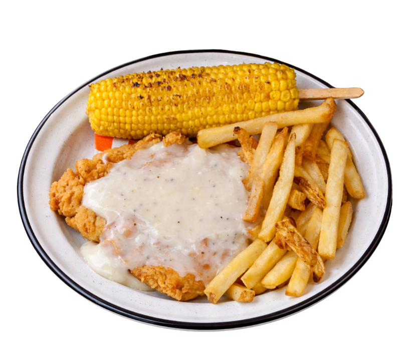 Pechuga de pollo empanizada aderezada con riquísimo country gravy, 150 gramos de french fries y 1 pieza de golden corn saznado