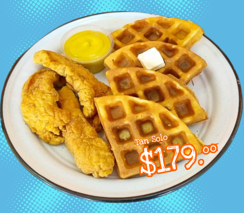 Delicioso waffle hecho al momento, acompañado de mantequilla, miel por separado, 3 riquísimos tenders y 1 aderrzo.