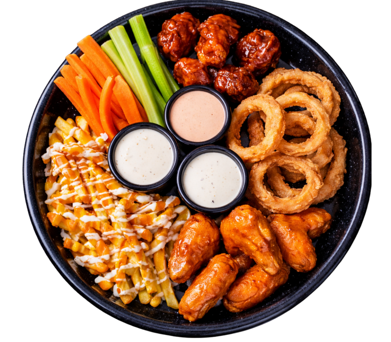 Tu eliges 26 piezas de boneless o 15 tenders o 1 kg de alitas bañadas en tu salsa favorita, 500 gr. de French Fries, 2 aderezos a elegir y 1 porción de bastones de apio y zanahoria
