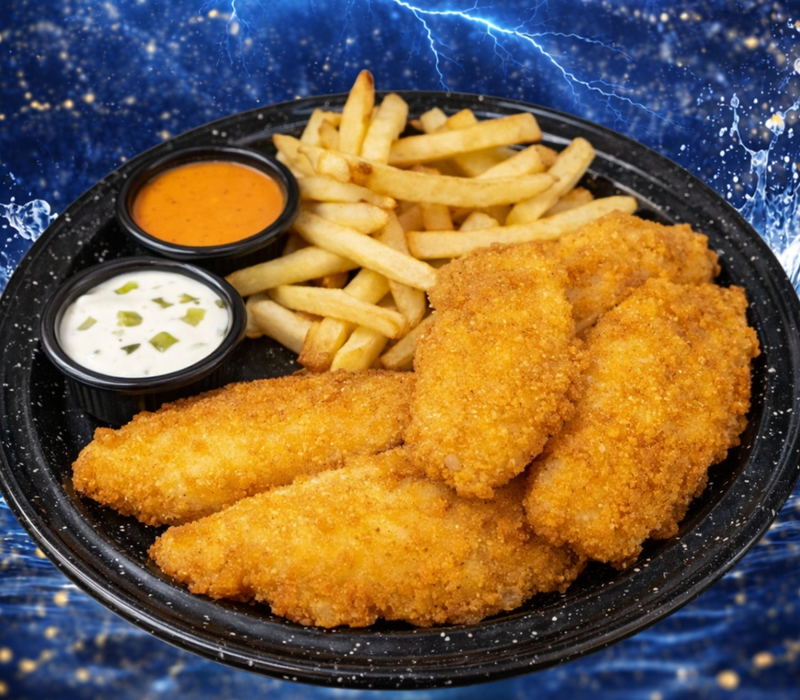 2 filetes de pescado empanizado acompañados de 200 gramos de papas a la francesa, 1 aderezo tarta ranch y 1 salsa buffalo