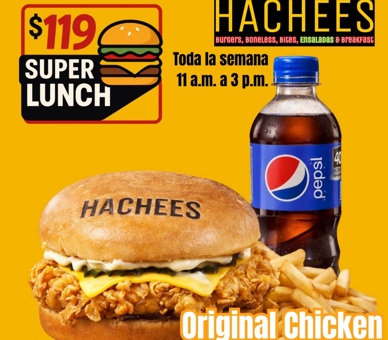 Ahora en Super Lunch La autentica y original hamburguesa de pollo con queso, mayonesa y pepinillos, acompañada de 150 gramos de papas a la francesas y 1 refresco de355 ml promocion valida del 17 de marzo al 14 de junio del 2026
