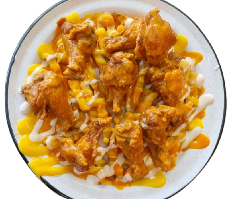 500 gramos de alitas bañadas en 1 salsa de tu eleccion, sobre una cama de french fries bañadas con queso cheddar, salsa y aderezo de tu eleccion.