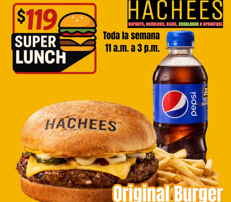 Ahora en Super Lunch La autentica y original hamburguesa de res con queso, mayonesa y pepinillos, acompañada de 150 gramos de papas a la francesas y 1 refresco de355 ml promocion valida del 17 de marzo al 14 de junio del 2026