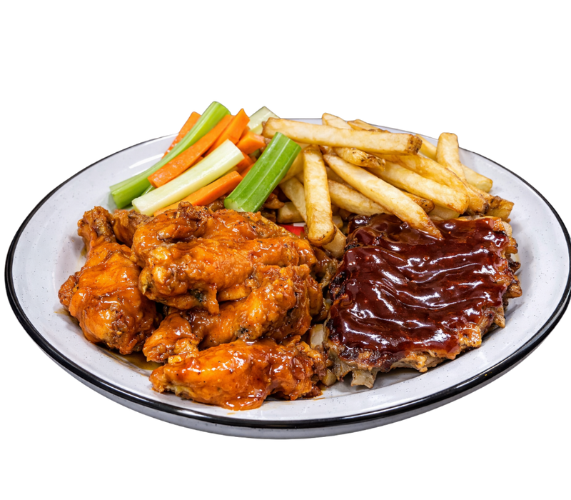 100 gr de costilla de cerdo bañada en salsa bbq, 350 gr de chicken wings, 150 gr de french fries, apio, zanahoria y 1 aderezo a elegir o si prefieres puedes cambiar tus alitas por boneles.