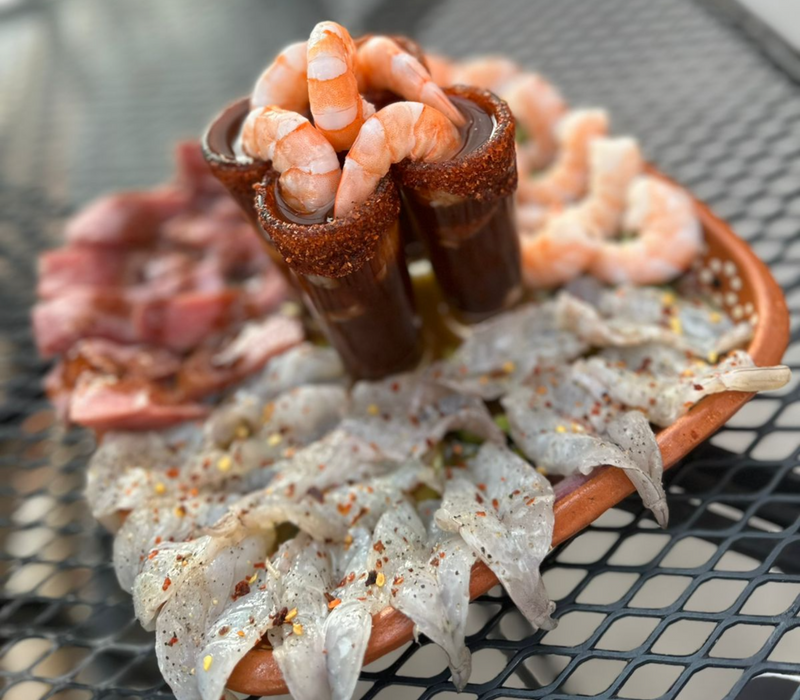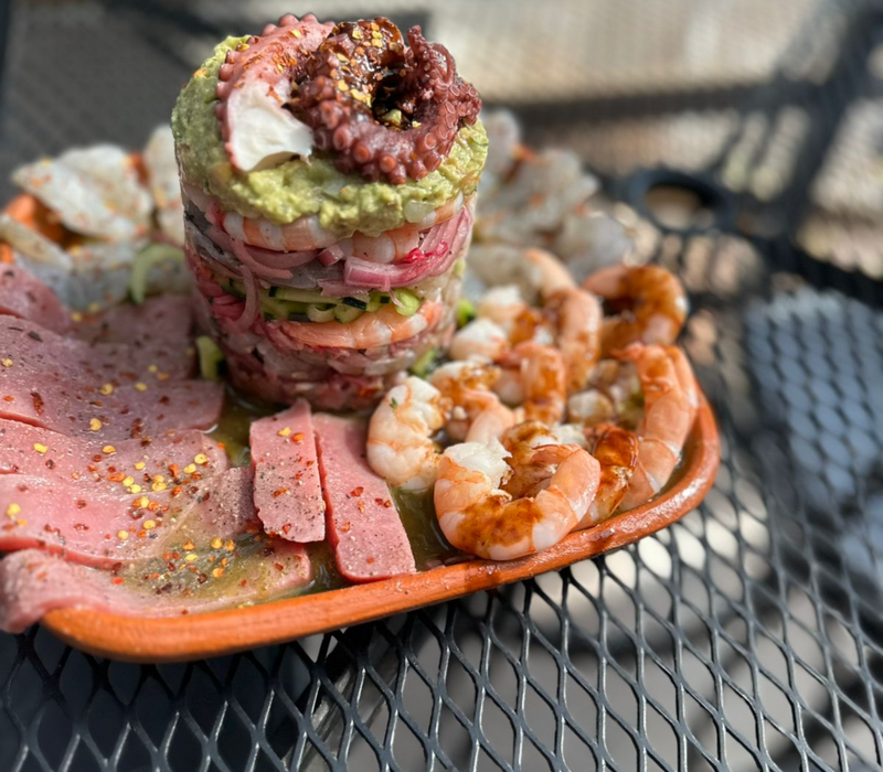 Camarón crudo, camarón cocido, pulpo, medallón de atún y callo de hacha en salsa de chile chiltepin