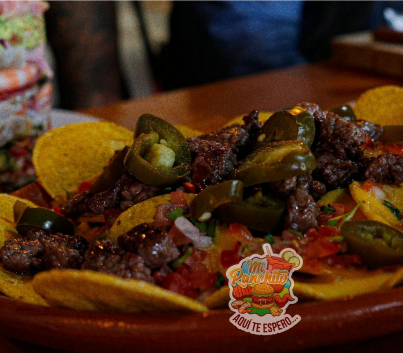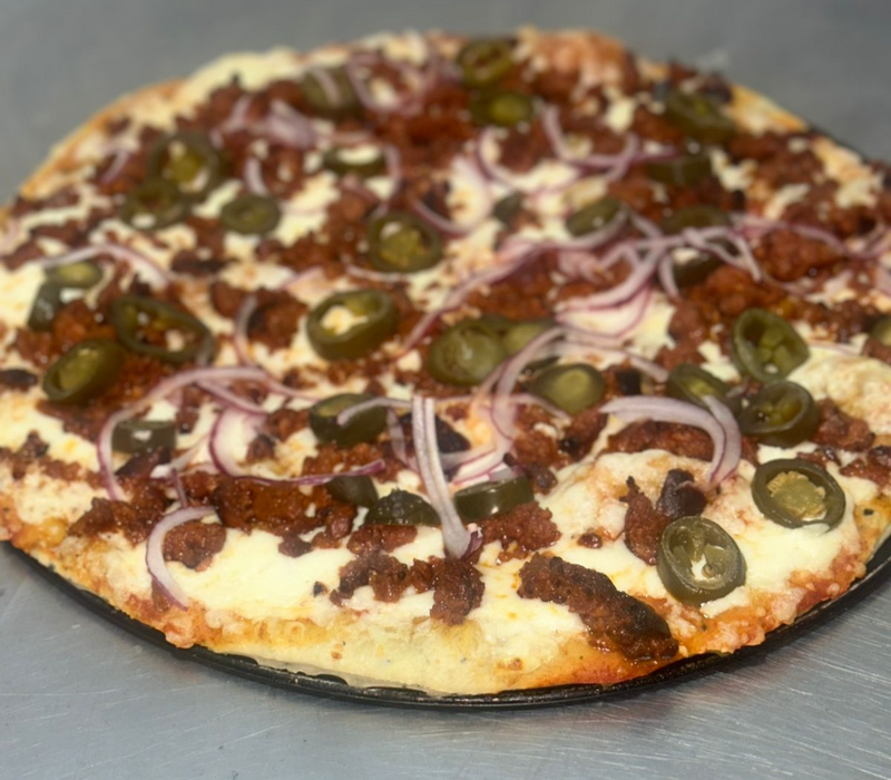Salsa de la casa, queso mozzarela, chorizo, cebolla y chiles