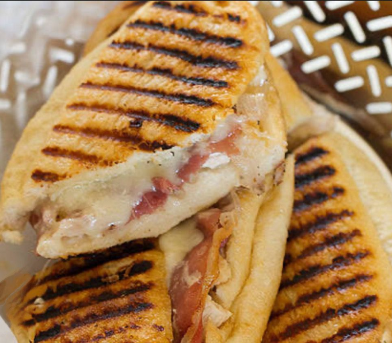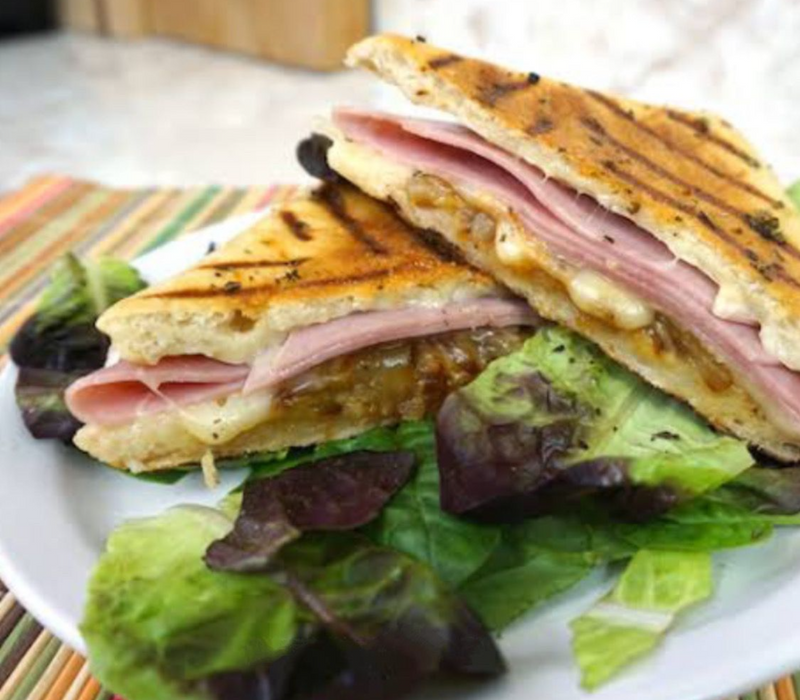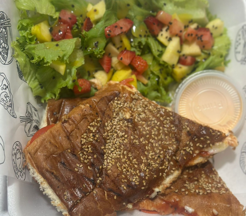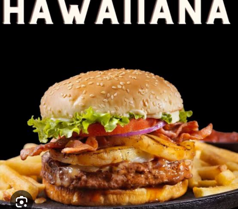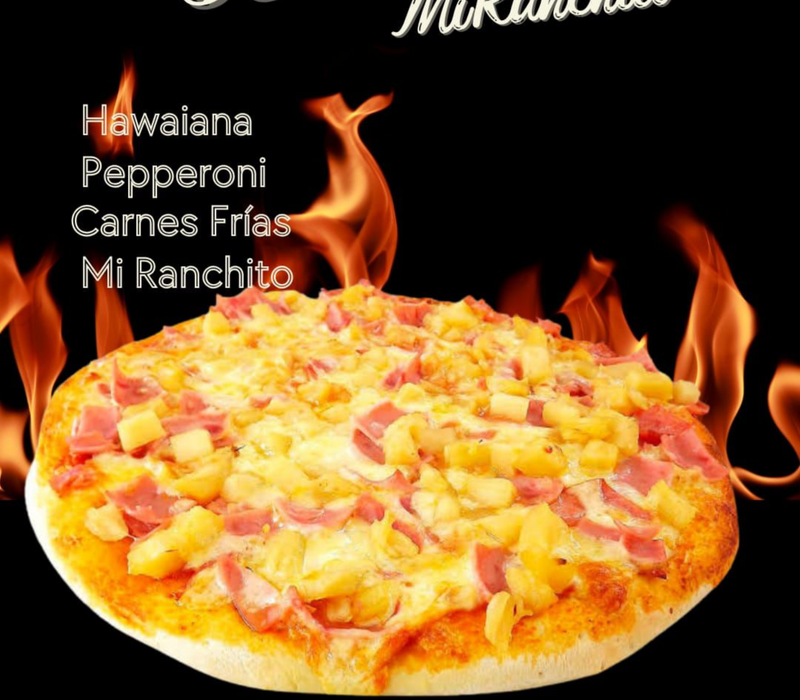 Salsa de la casa, queso mozzarela, jamón de pavo y piña