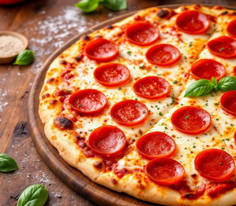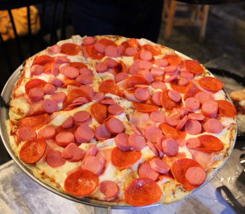 Salsa de la casa, queso mozzarela, pepperoni, salchicha y jamón de pavo
