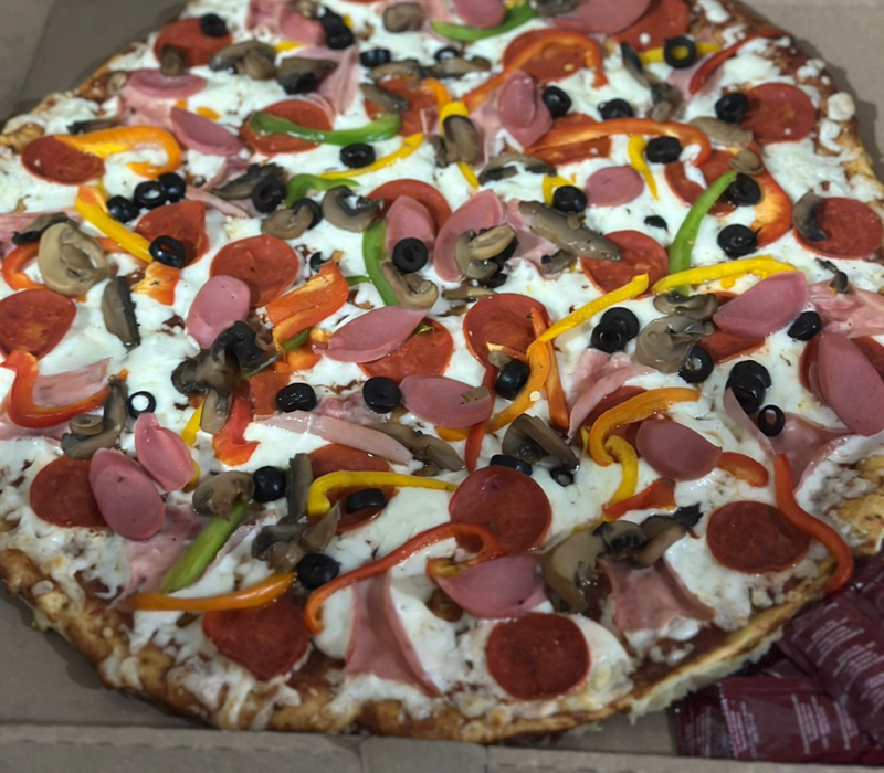 Salsa de la casa, queso mozzarela, jamón, salchicha, pepperoni, pimiento, cebolla, aceituna y champiñones