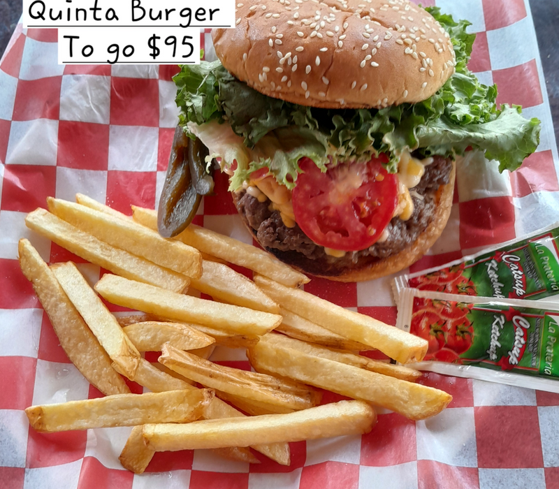 Carne 100% de Res, 180 gr. Pan, queso, lechuga, jitomate, papas fritas y aderezo de la casa