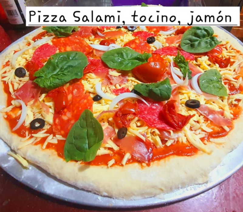 Queso, jamón salami, tocino, Tomate/albahaca