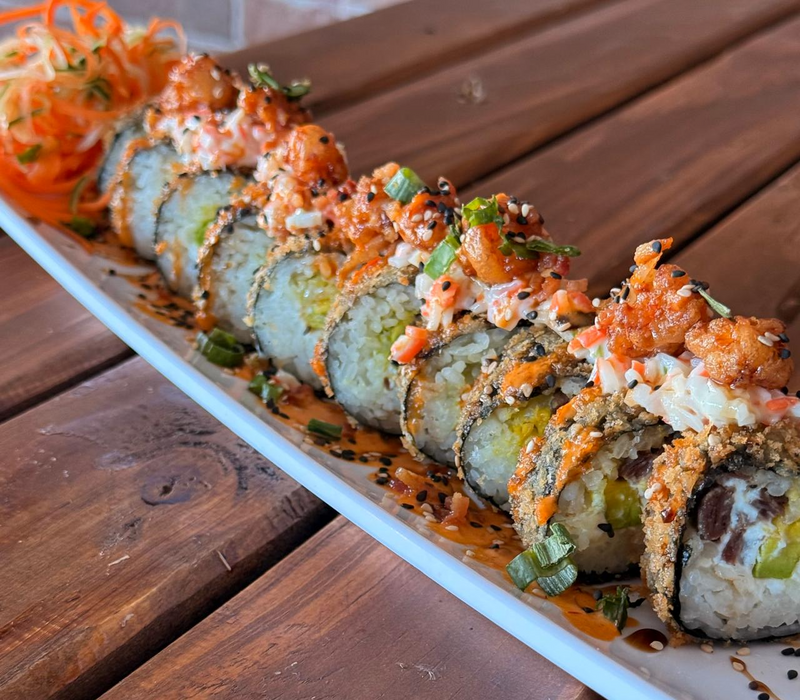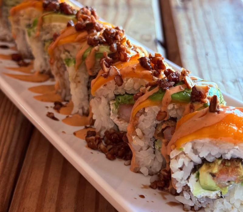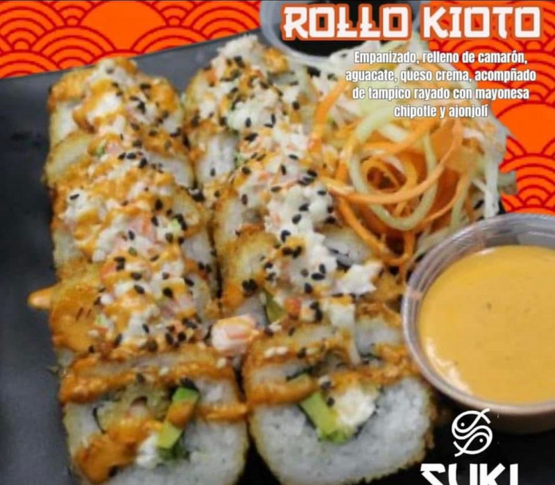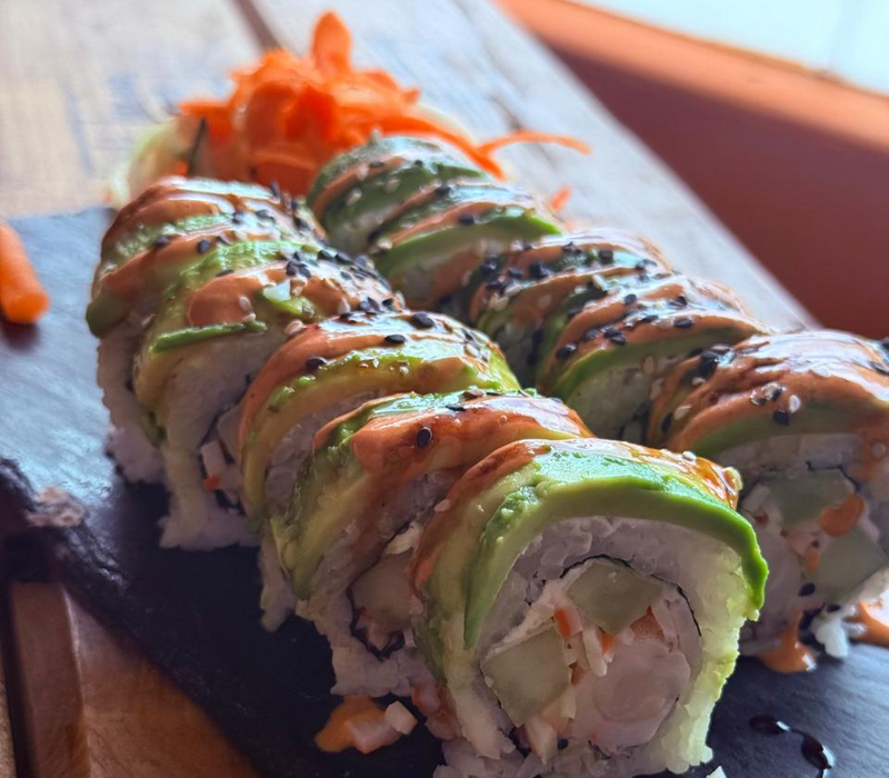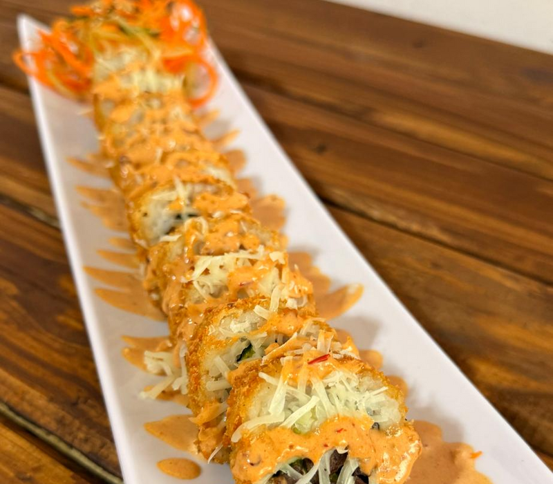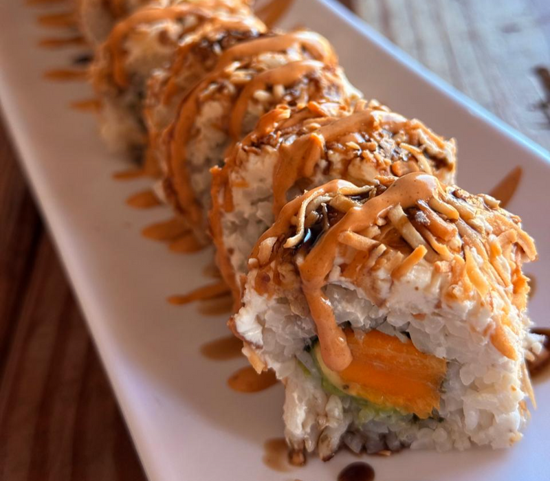 Arroz, queso crema, aguacate, pepino, tampico, rayado con salsa de anguila y mayonesa con chipotle.