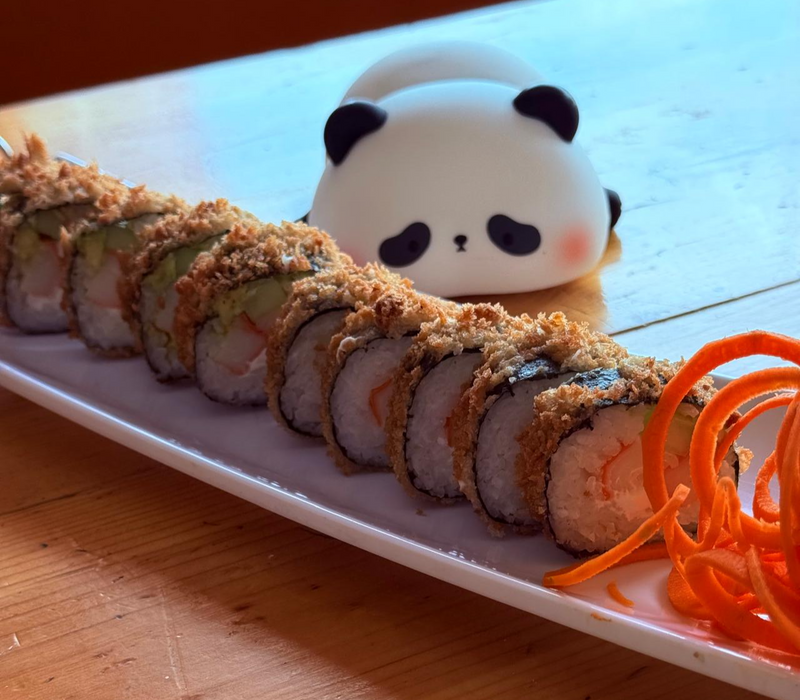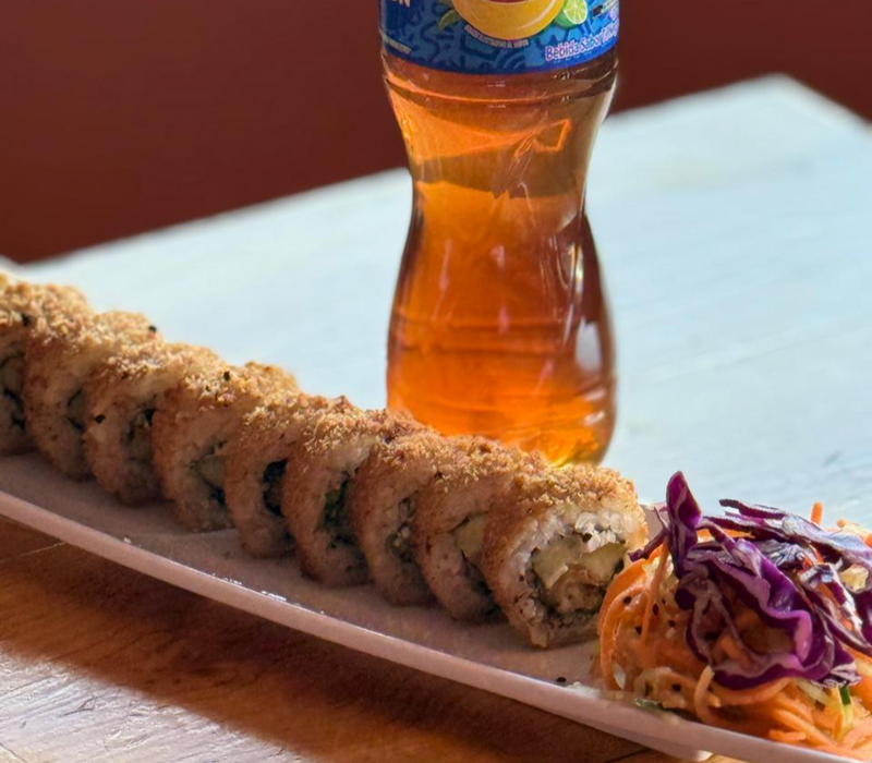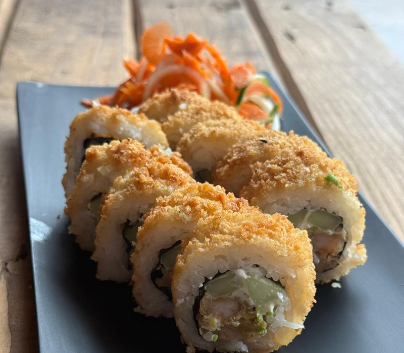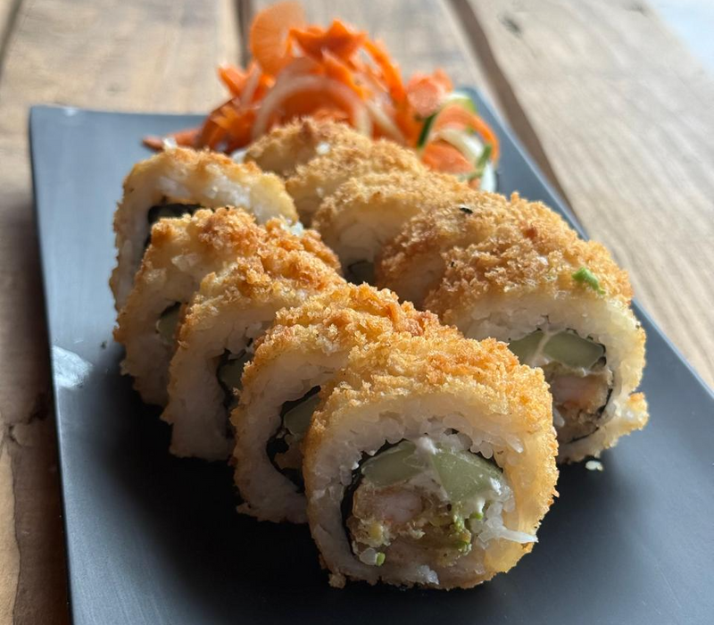 Rollo california empanizado relleno de camarón, pepino, aguacate y queso crema. Acompañado de arroz yakimeshi de verduras.