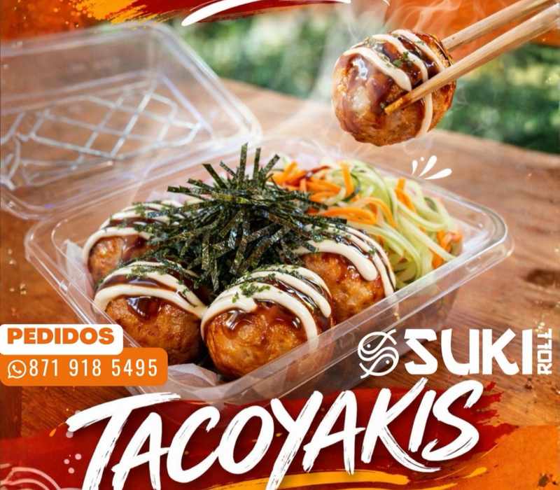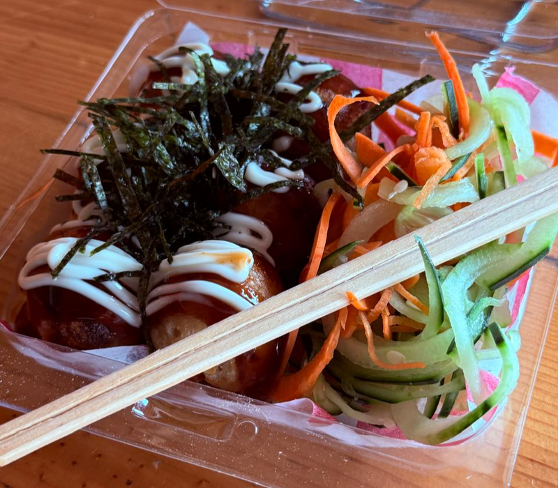 BOLITAS RELLENAS DE REPOLLO, PIMIEMTOS MORRON, CEBOLLIN Y PULPO . ADEREZADOS CON SALSA TAKOYAKI Y MAYONESA.