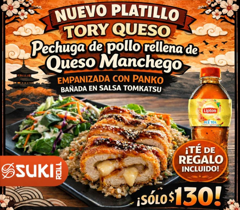 Pechuga de pollo rellena de queso crema, empanizada con panko bañada en salsa tomcatsup. Acompañado de arroz yakimechi y ensalada verde.