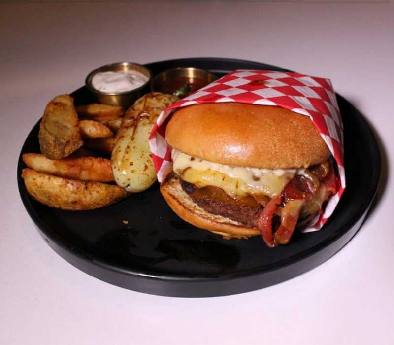 Pan brioche, carne sirloin, boneless con salsa a elegir, queso americano, chihuahua, aguacate, cebolla asada y papas a elegir