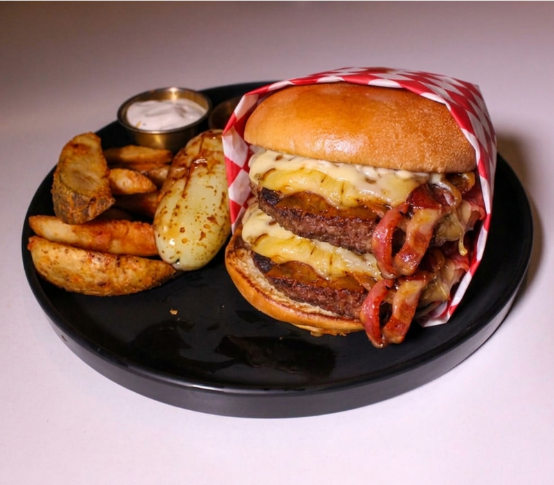 Pan brioche, doble carne sirloin, tocino, doble queso americano, chihuahua, cebolla asada y papas a elegir