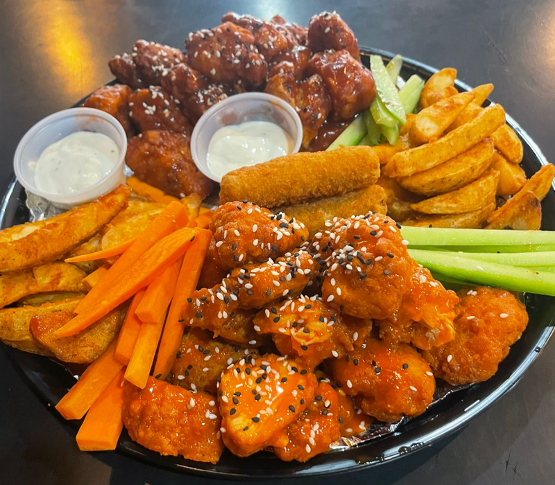 1/2 ord. boneless, 1/2 ord. alitas, 2 dedos de queso, papas gajo y vegetales.